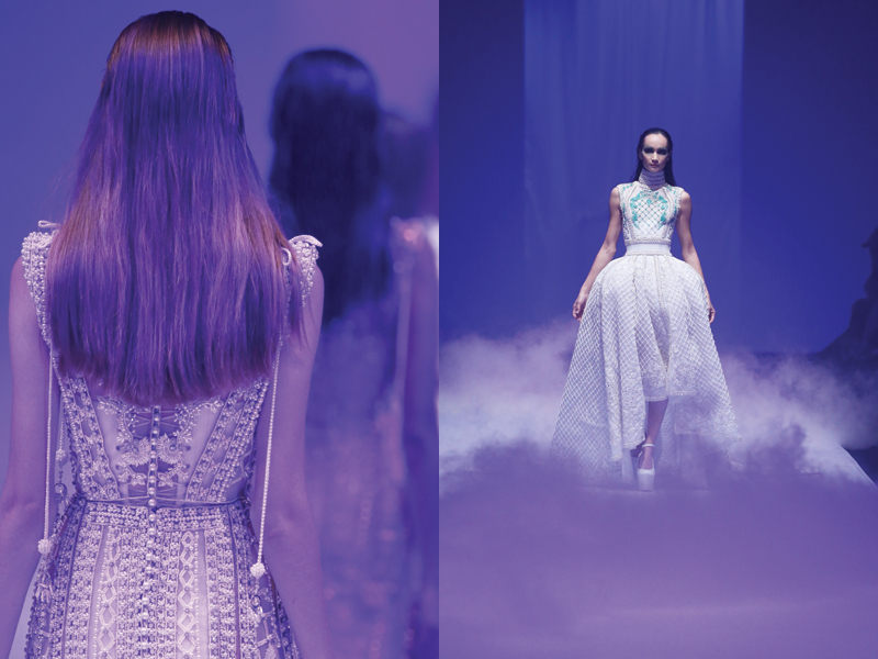 Gemerlap payet yang berkilau menggambarkan setiap tetes air murni yang mengalir dan memendarkan cahaya, tertata manis pada gaun Tex Saverio Prive bertajuk "Trism". Tata panggung yang dramatis semakin menunjang penampilan gaun adibusana yang seluruhnya dibuat menggunakan tangan. Penuh intrik, teknik bordir yang presisi, dan siluet teatrikal yang khas, Tex Saverio berhasil menciptakan momen yang tak hanya social media-worthy, tetapi juga sangat memanjakan mata lewat parade gaun indah yang menyentuh lantai.