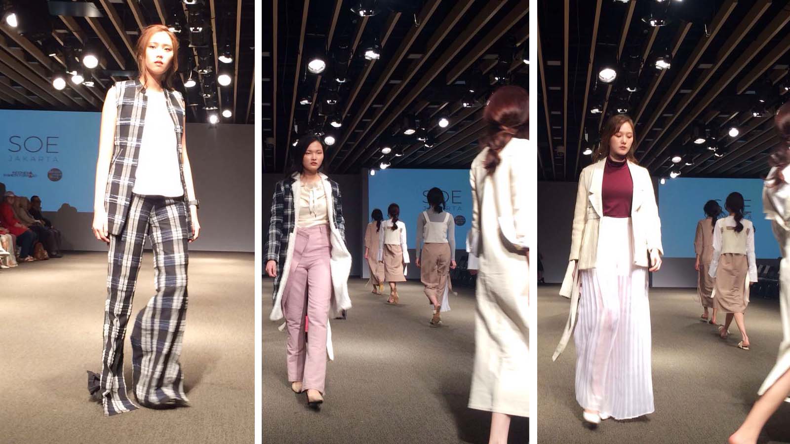 Terinspirasi oleh siluet kota Jakarta dengan pencakar langitnya dan motif-motif serta warna-warna khas Betawi, SOE Jakarta kembali menampilkan desain-desain dekonstruktif tumpuk yang dibuat dari hasil buah tangan perajin kain tradisional Indonesia asal Pekalongan. Aksen lipit, jaring, dan bahan denim tampak mendominasi koleksi SOE Jakarta yang khusus dibuat untuk pasar Korea Selatan ini. Garis desain yang tampak tegas, rapi, sekaligus unik ini ditabrakkan dengan warna-warna lembut gading, cokelat muda, indigo, tampak sungguh bergaya di atas panggung.