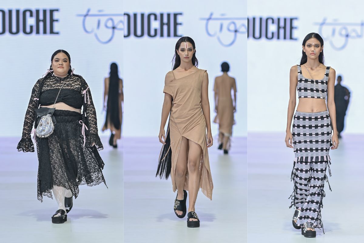 Warna-warna netral, seperti hitam, putih, dan cokelat muda juga hadir pada koleksi dari DOUCHE X Tigah Home untuk JFW 2024. Busana-busana berdesain unik dari DOUCHE berpadu apik dengan