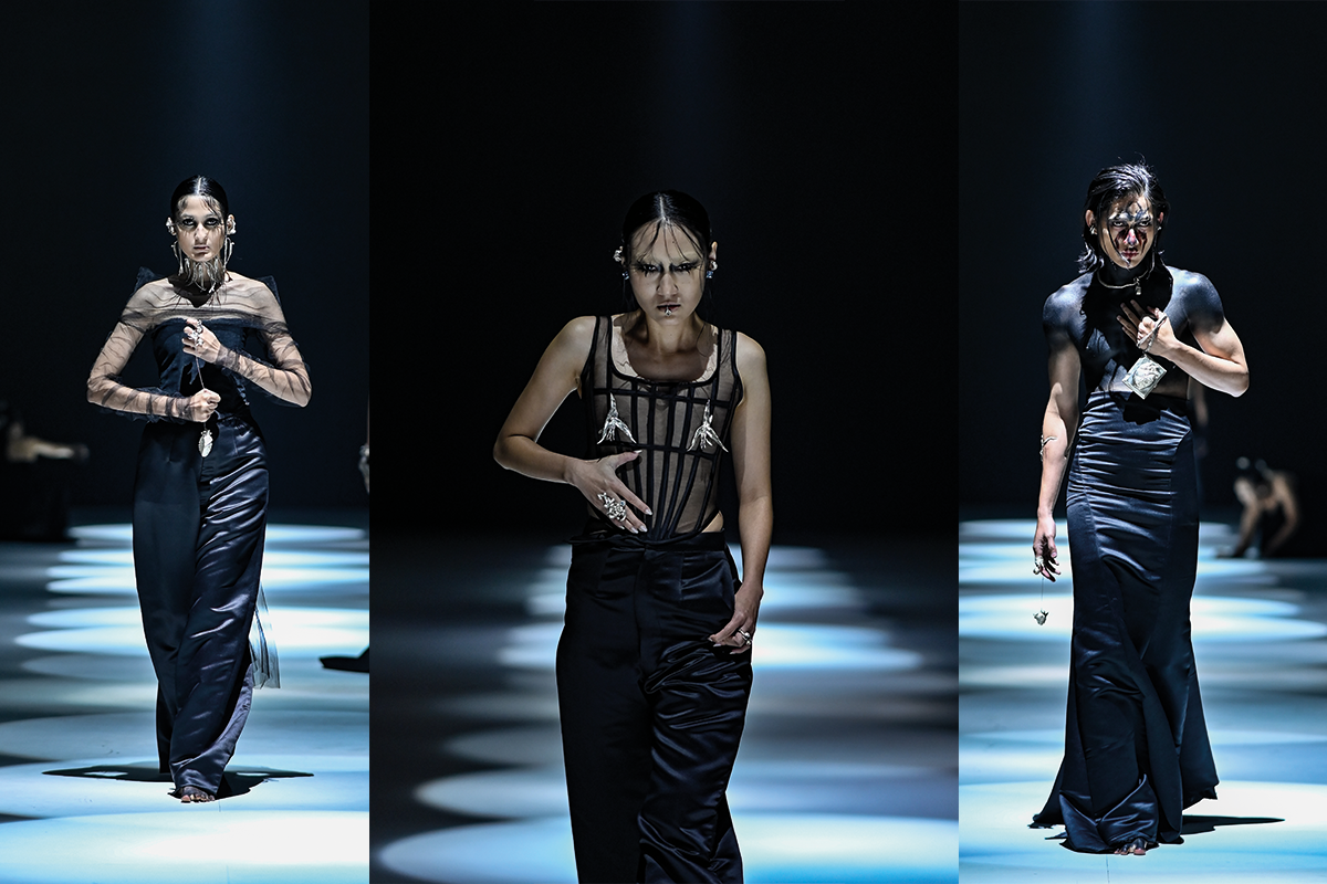 tulle hitam transparan untuk memperkuat kesan dramatis pada tubuh model. Penggunaan sejumlah korset yang merestriksi tubuh memberikan kesan “terkurung” sesuai dengan tema koleksi.