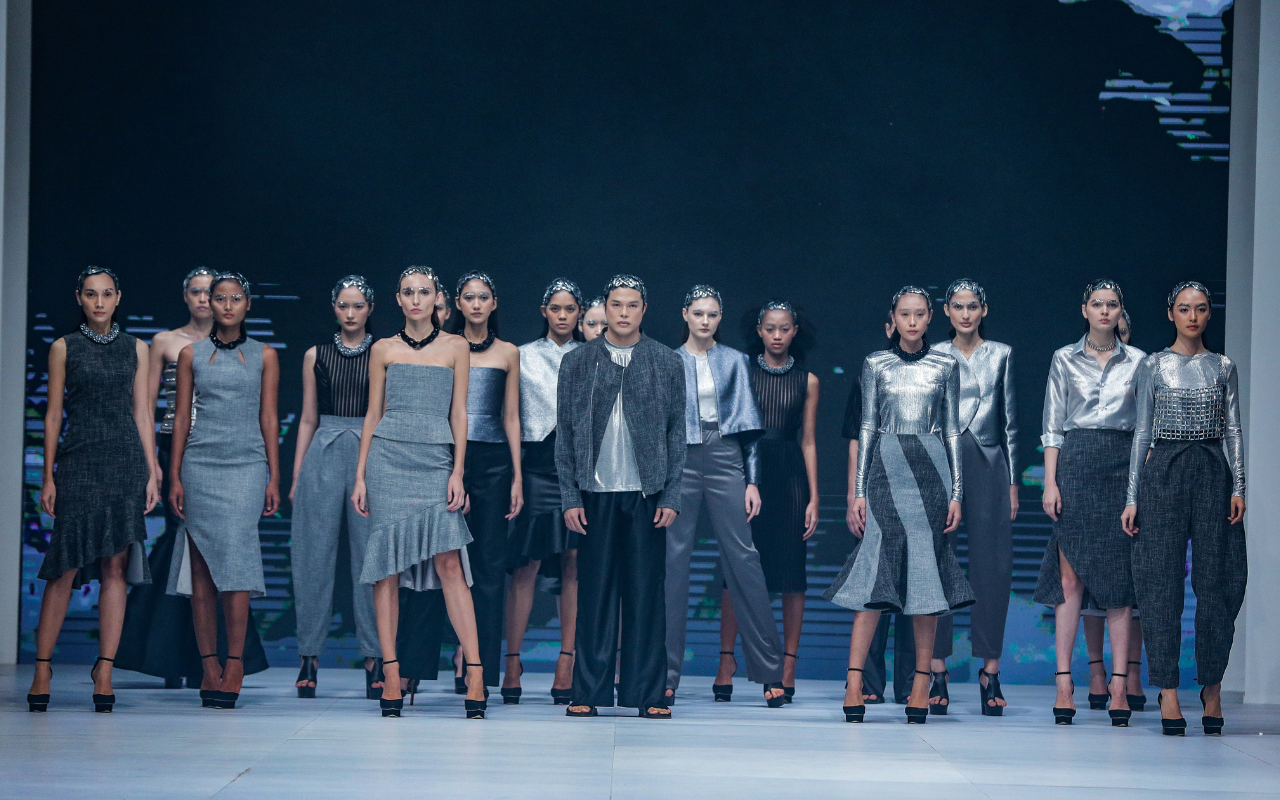 Koleksi monokrom yang jauh dari kata membosankan. Yosafat Dwi Kurniawan berhasil menginterpretasikan konsep modern design ke dalam sebuah koleksi kohesif yang struktural namun tetap anggun. Koleksi ini sepenuhnya terdiri dari warna-warna cenderung gelap seperti kelabu, chrome silver, biru tua, dan hitam.