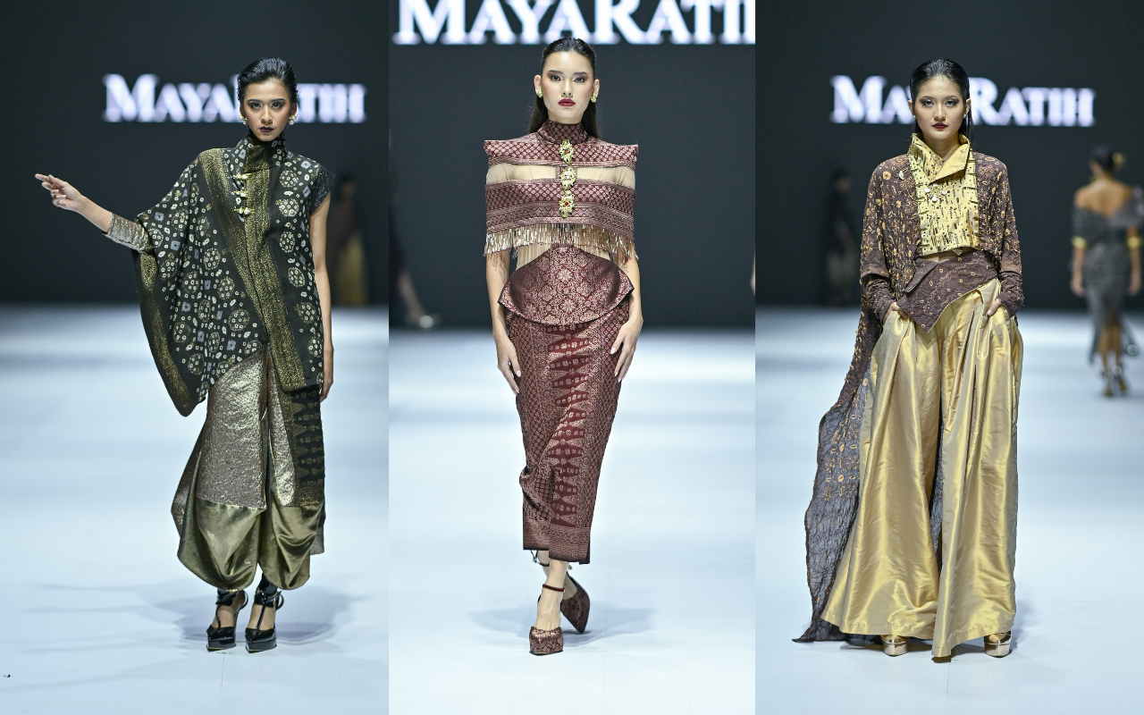 Foto: Deretan busana dari jenama MayaratihMayaratih tahu betul cara menghargai lekuk tubuh wanita, menjadikan siluet menawan dan keseluruhan look terkurasi dengan elegan. Terdapat banyak rok draping dan struktur atasan body sculpting menggunakan kain songket dan satin gradasi. Pilihan warnanya masih berporos sama dengan koleksi laki-laki yaitu hitam, cokelat, marun, hijau, dan sentuhan emas di sana-sini.