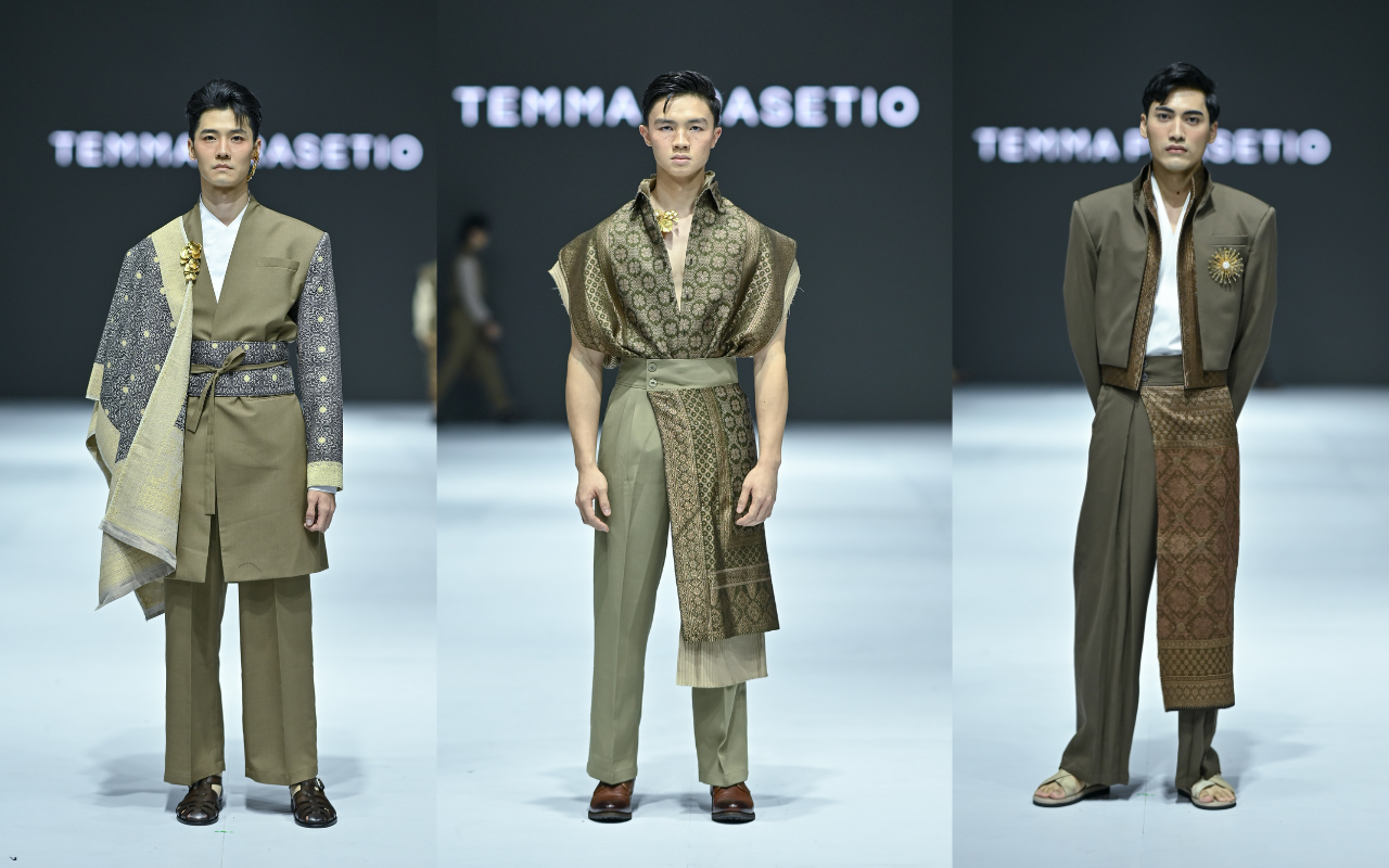 Foto: Deretan busana koleksi dari Temma PrasetioMuncul juga detail anyaman atau panel songket yang hanya diterapkan di satu lengan. Layering minimalis mempertegas struktur yang ditata rapi. Semua model tampak necis dengan rambut rapi dan pulasan rias natural untuk memperkuat kesan maskulin. Siluet tradisional menswear yang boxy dibuat lebih edgy menggunakan cumberband atau ban pinggang tebal, mengaksentuasi garis tubuh model.