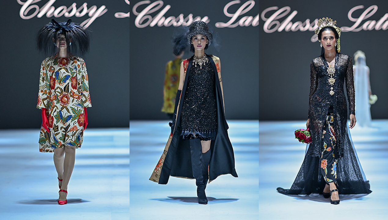 Lepas dari sesi ini, Chossy Lalu menampilkan koleksi kebaya panjang dan kain batik, lengkap dengan sanggul yang dihiasi tusuk sanggul dan melati sebagai perwakilan busana pernikahan. Tak hanya berwarna cerah, terselip
