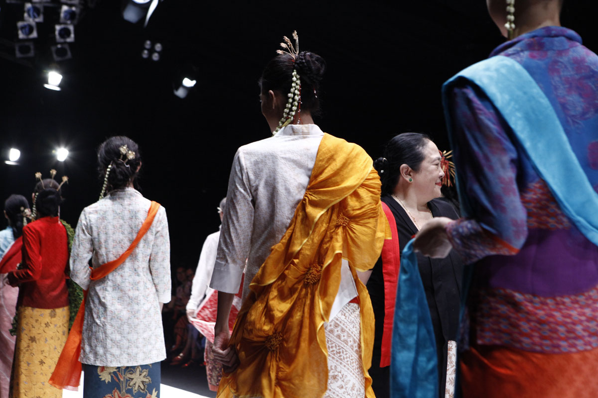 Sutra Dewangga diterjemahkan menjadi helai-helai kain dengan motif dan warna yang indah; cerah, seperti ciri khas rumah mode yang sudah aktif mengeksplorasi kain nusantara sejak tahun 80-an ini. Kain-kain berwarna merah, biru, dan kuning ini berpadu dengan atasan menyerupai kebaya encim dan kerah-kerah cheongsam yang feminin, namun dengan siluet yang tegas, tanpa ada kesan seronok.