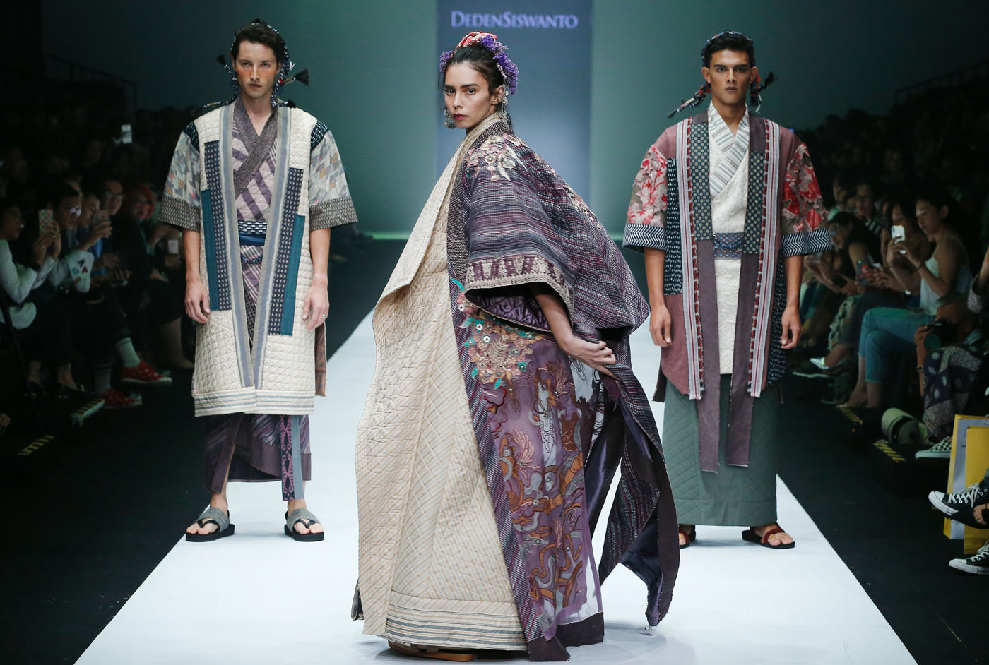 Deden Siswanto menutup rangkaian fashion show ini dengan menampilkan koleksi yang diberi nama “Kagirinaku” yang berarti “tanpa batas”. Terpesona oleh strata sosial rakyat Jepang pada masa Feodal, Deden Siswanto menampilkan desain kimono bergaya deconstructed, dengan juga menampilkan patchwork, dan teknik pattern blocking. Fusi warna botanikal seperti beige, ungu, kuning, hijau, dan pink pada berbagai material yang terdiri dari katun, denim, batik, dan tenun, koleksi ini memberi kesan busana yang urban dan dinamis. (GAB/ZGY)